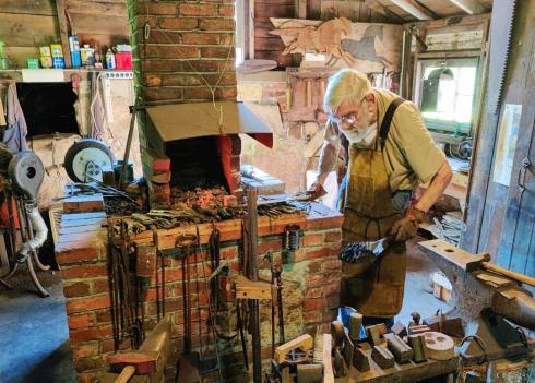 The Bourne Society for Historic Preservation held its Everything Blueberry event August 10th. It was a perfect beach day with an early afternoon high tide, so attendance was lower than it should have been. Those of us who did attend got to see blacksmith Mike Kelley working the antique Alonzo Booth forge, listened to Jim Dineen describe the society’s collection of horse-drawn wagons and sleighs, and toured the beautifully restored Briggs-McDermott house. Jim serves as the society’s long-time property manager and is one of its artifact restorers. Toni Dering, Margot Jenkins, Deborah Burgess, and society president Louise Innis worked as docents in the house. We also enjoyed what must be the world’s best blueberry cobbler, made by society member Emilie Martin.