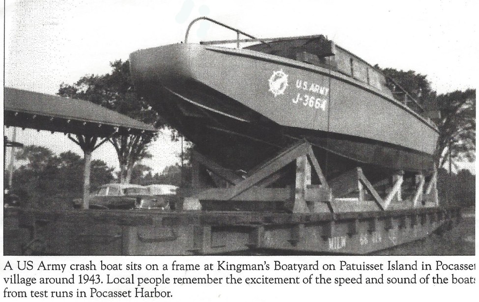 I found the information I needed on the blog site of Scott Zeien, the current owner of Kingman Yacht Center. There I learned that those boats were not Navy P.T. boats but were smaller harbor rescue boats for the Army. In Scott’s words “In 1952, T. Barry Kingman Construction Company won the contract to build 33, 37-foot wooden “J” patrol boats for the U.S. Army Transportation Corps. At the height of construction, Kingman employed 65 yard personnel, and 10 office personnel and draftsmen. A boat was built and launched every 3.5 days, sea trialed in the harbor, then loaded onto trucks for transport to the Pocasset train station and off to the Army.”